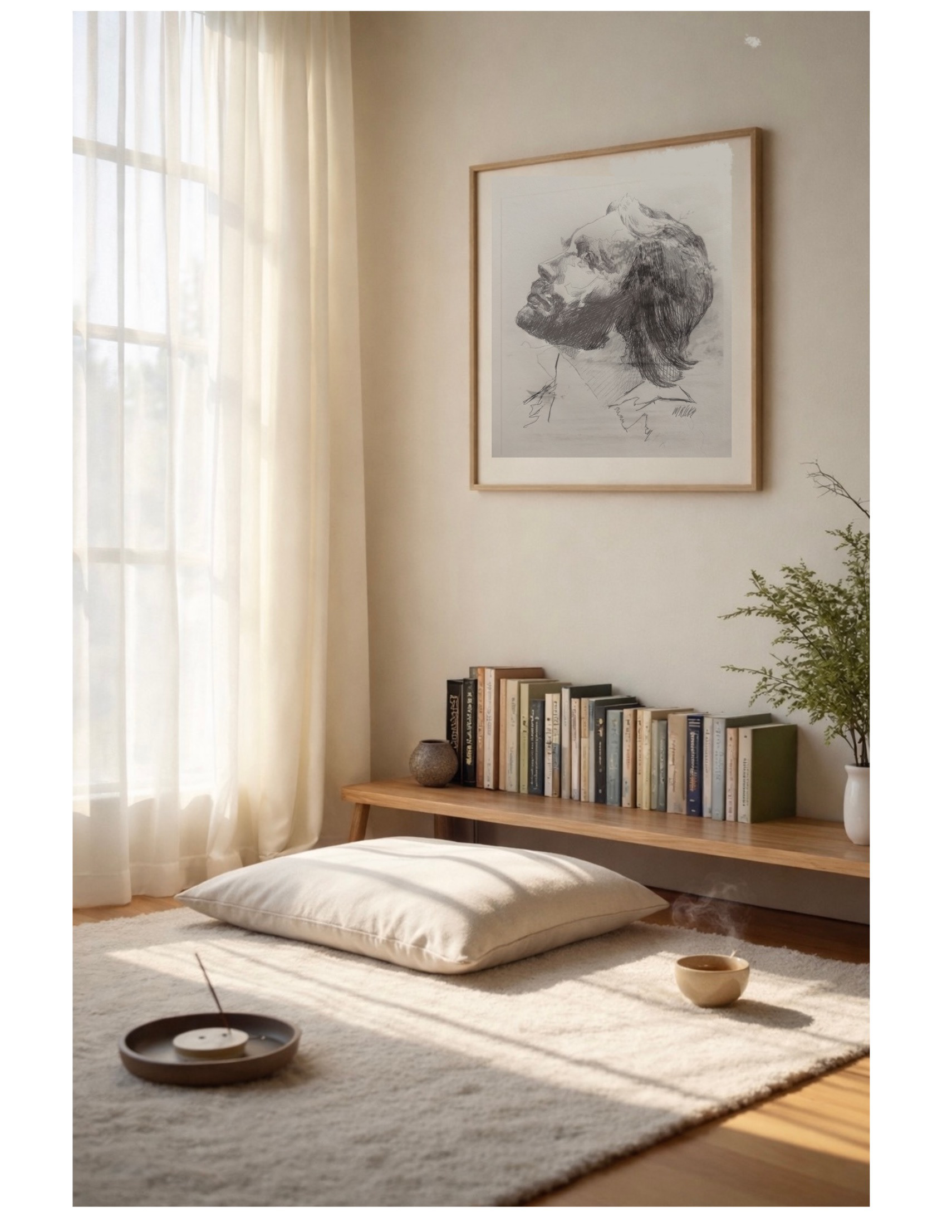 I wanted the drawing to feel intimate, almost private, as though we are witnessing a moment of inward resolve. The upward gaze becomes an act of surrender, a quiet alignment with divine order. It suggests that happiness and peace are not achieved through mastery of circumstance, but through recognition of the Way and the humility to follow it.